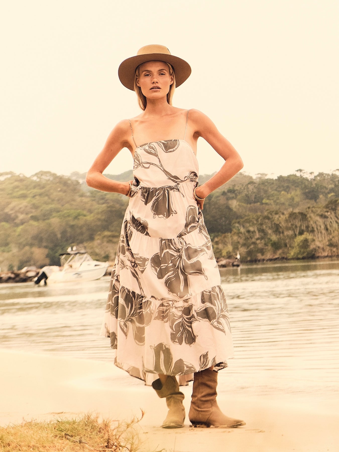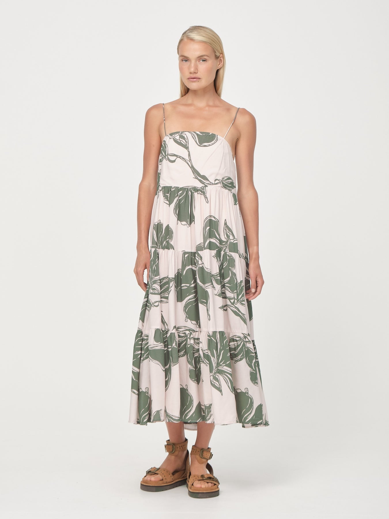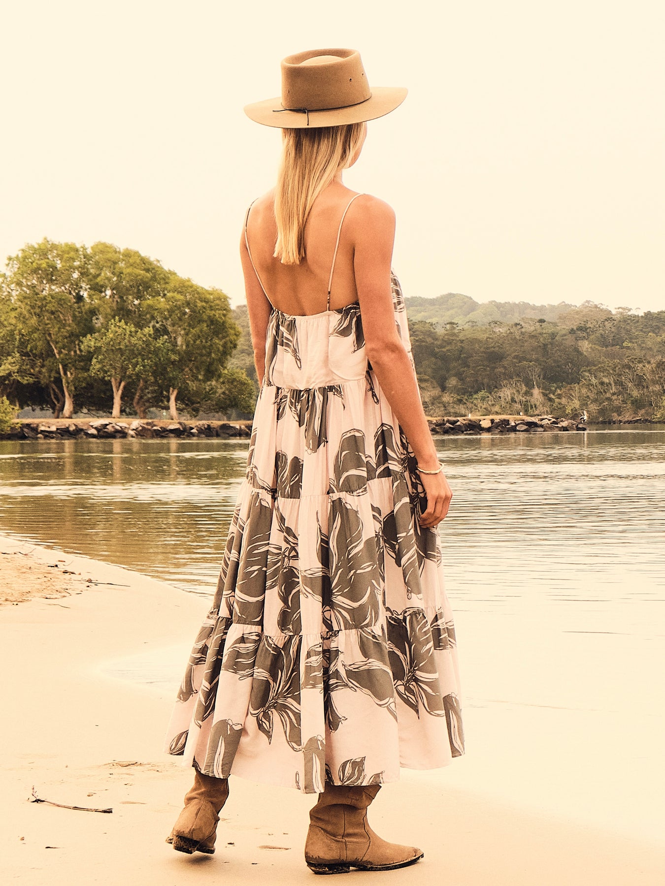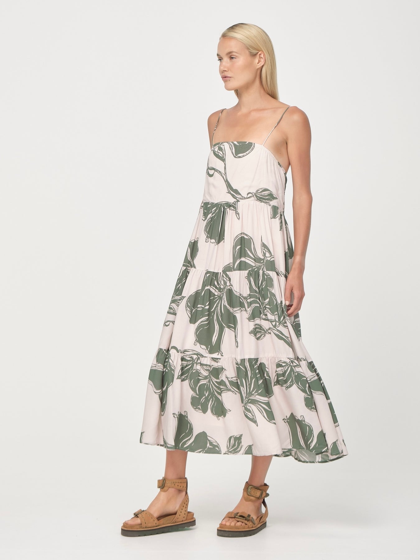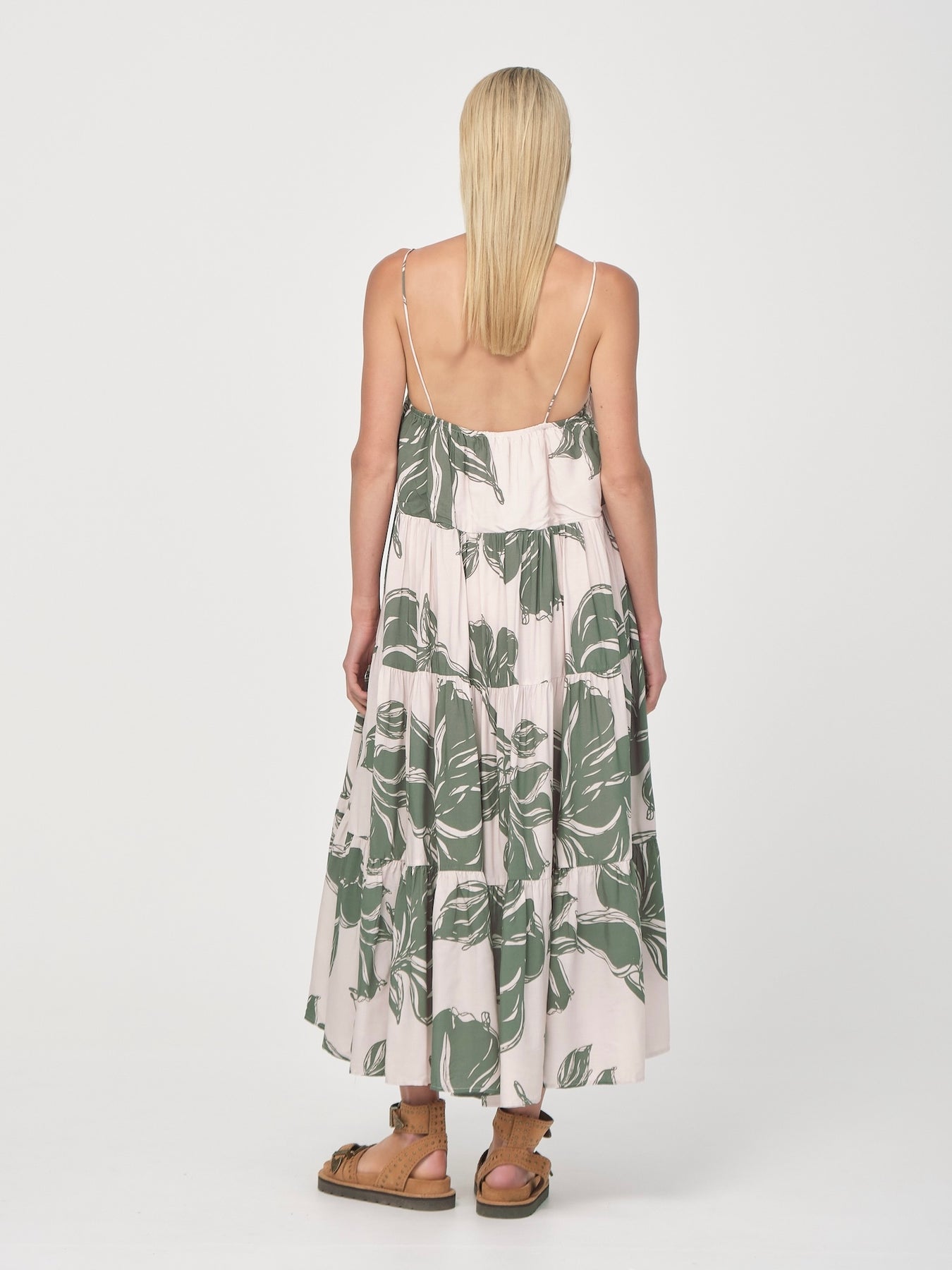 The Avalon Billow Dress is a breezy blend of elegance and ease, crafted from 100% LENZING™ ECOVERO™ Viscose for a soft, fluid drape. Featuring our exclusive hand-drawn print, a relaxed, tiered silhouette and fully lined construction, designed with spaghetti straps and an elastic bust opening, it provides a comfortable, flexible fit combining comfort with a touch of romance. The elastic bust offers a relaxed feel, and the back can be gently pulled down to adjust how the straps sit on your shoulders—offering ease and flexibility without the need for adjustable straps. Pair it with sandals for a carefree day look, or dress it up with layered jewellery for an elevated look.
